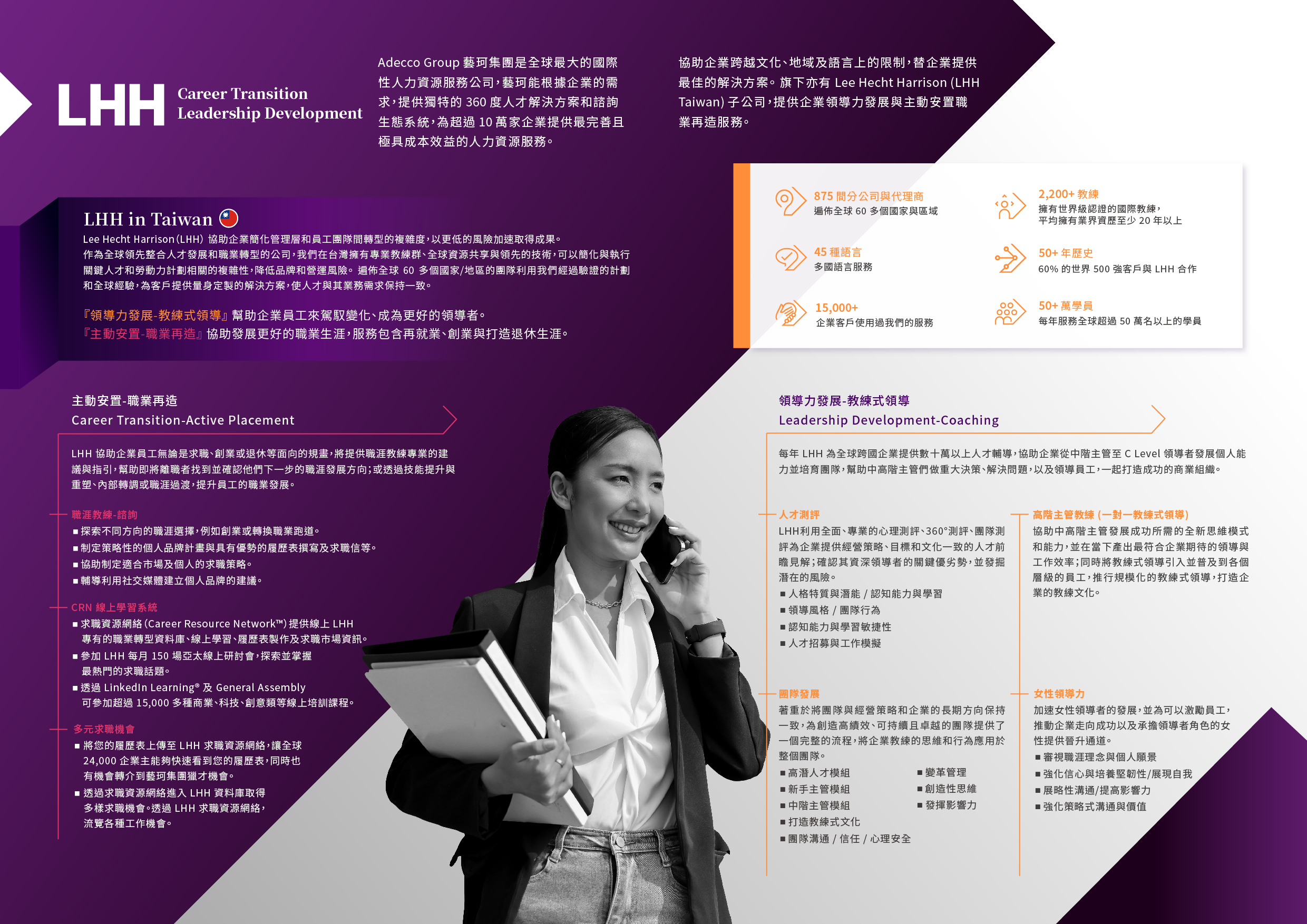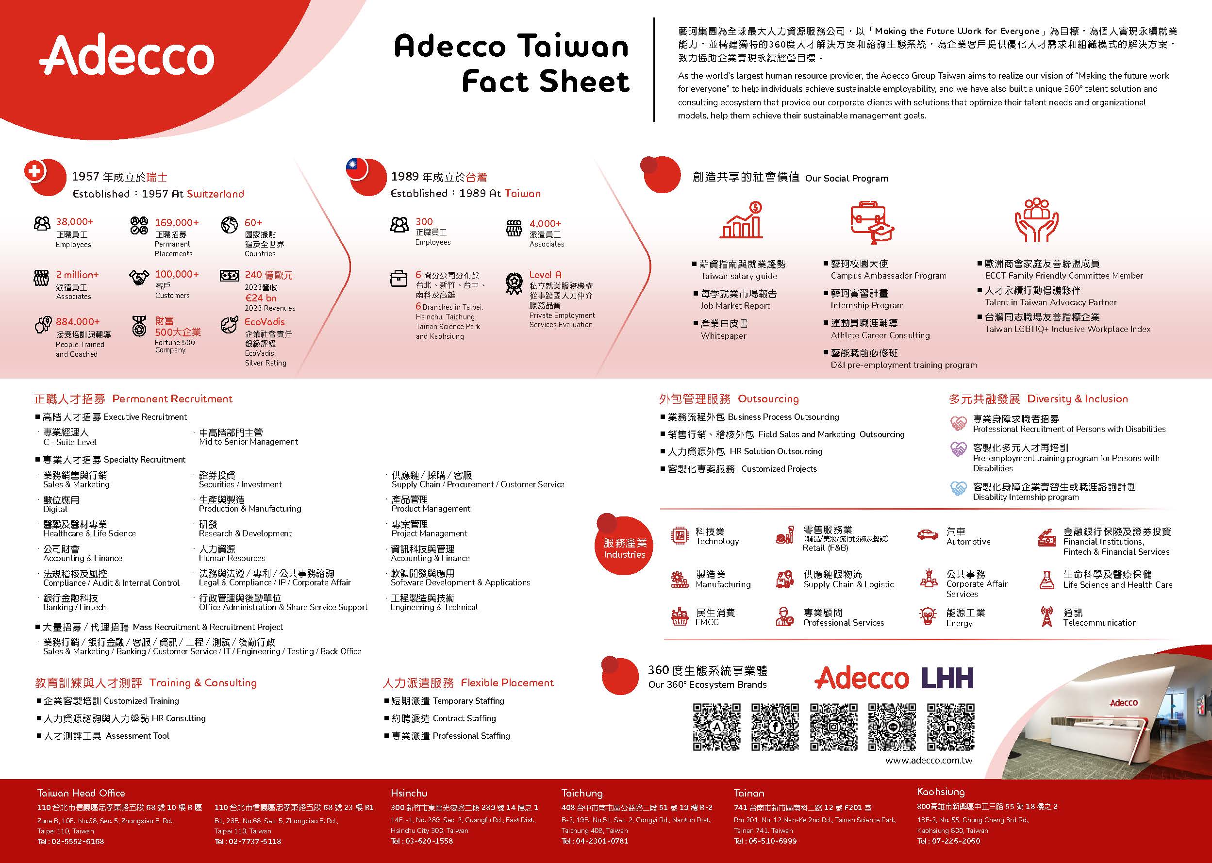 Founded in 1989, Adecco Taiwan has eight branches across Taipei, Hsinchu, Taichung, Tainan, and Kaohsiung, with nearly 300 consultants. It offers Permanent Recruitment, Flexible Placement, Outsourcing, Training & Consulting, and DE&I services. LHH Taiwan focuses on leadership development and career transition. Committed to "Making the future work for everyone," Adecco Taiwan provides 360-degree HR solutions.